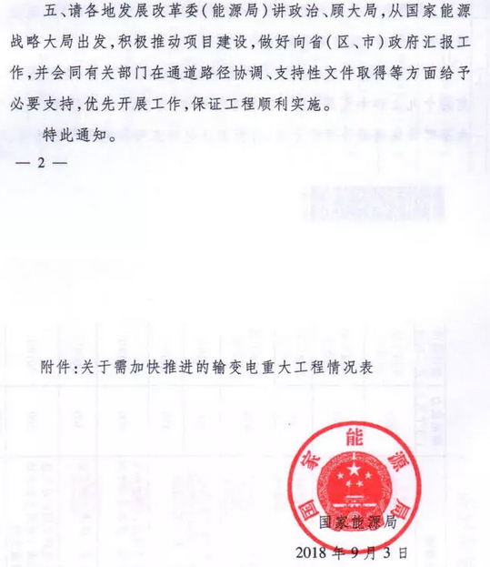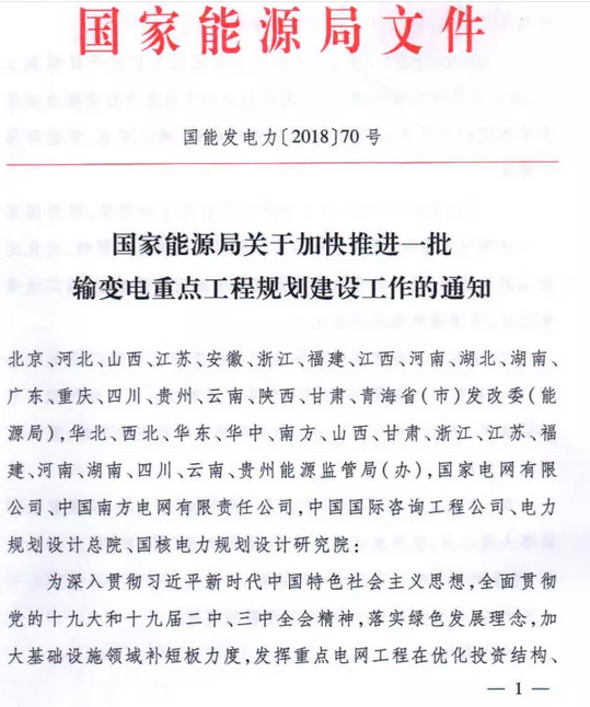 9月7日獲悉,國(guó)家能源局印發(fā)《關(guān)于加快推進(jìn)一批輸變電重點(diǎn)工程規(guī)劃建設(shè)工作的通知》國(guó)能發(fā)電力〔2018〕70號(hào),《通知》指出,為加大基礎(chǔ)設(shè)施領(lǐng)域補(bǔ)短板力度,發(fā)揮重點(diǎn)電網(wǎng)工程在優(yōu)化投資結(jié)構(gòu)、清潔能源消納、電力精準(zhǔn)扶貧等方面的重要作用,加快推進(jìn)青海至河南特高壓直流、白鶴灘至江蘇、白鶴灘至浙江特高壓直流等9項(xiàng)重點(diǎn)輸變電工程建設(shè),合計(jì)輸電能力5700萬(wàn)千瓦(工程見附件)。